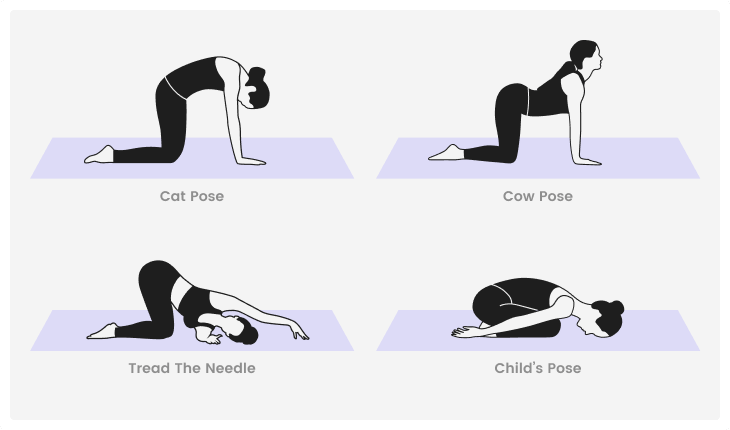 Like cat-cow, you’ll want to start this exercise in tabletop position with your wrists in alignment with your shoulders. As you breathe in, lift your right arm off of your mat and twist it upwards. Then as you breathe out, thread your right arm underneath your left arm. As you do this, your right temple and shoulder will naturally come to rest on your mat. Move your left fingers out more towards the top of the mat to feel a stretch within your right shoulder. Hold for several breaths and then switch sides.